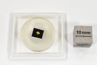 Коллекция Систематическая коллекция, №97019. Друзочка (0.3 х 0.2 х 0.1 см) мелких тёмно-жёлтых гексагонально-таблитчатых кристаллов ермаковита. Фрагмент голотипа. На углеродном скотче, наклеенном на шашку из эпоксидной смолы для микрозонда. Образец в пластиковой коробке. Длина экспоната 0.3 см.