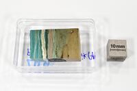 Коллекция Систематическая коллекция, №97020. Очень мелкие (до 15 микрон) изометричные зёрна присциллагрюита-(Y) в полосчатом фторапатит (зелёные слои) - кальцитовом (светло-коричневые, бежевые и белые слои) мраморе. Зёрна присциллагрюита - в апатитовых прослоях. Полированная пластинка 3.5 х 2.3 х 0.7 см. Длина экспоната 3.5 см.