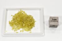 Коллекция Систематическая коллекция, №97056. Множество отдельных зёрен ("россыпь") ярко-жёлтого прозрачного бербанкита размерами от 1 до 6 мм. Длина экспоната 0.6 см.Размер минерала 0.6 см.