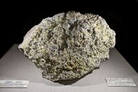 Коллекция Систематическая коллекция, №97195. Крупный штуф размерами 65 х 35 х 35 см, сложенный родингитизированной серпентиновой породой, покрытой с одной стороны коркой кристаллов зеленовато-коричневого топазолита размером до 1 см с <окатанными> выпуклыми гранями. Корка имеет <почковидное> строение с размером отдельных <почек> до 7 см. Кристаллы андрадита распределены равномерно, напоминая сложение гранатового плода. Между кристаллами андрадита светло-серый серпентин. Длина экспоната 65 см.