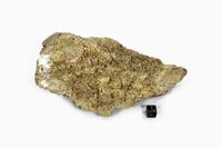 Коллекция Систематическая коллекция, №97408. Бесцветные чечевицеобразные двойники шабазита (факолита) до 2 мм на друзе бежевых дисковидных кристаллов пренита до 1 см на сланцеватой породе. С тальком. Пренит присыпан мелкими кристаллами пирита. Штуф 18 х 9 х 8.5 см. Длина экспоната 18 см.Размер минерала 0.2 см.