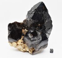 Коллекция Систематическая коллекция, №97462. Друза столбчатых кристаллов тёмно-дымчатого кварца (мориона) размером до 16 см на альбит-микроклин-кварцевом агрегате. Длина экспоната 16 см.Размер минерала 16 см.