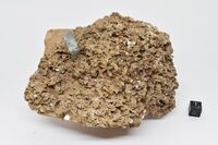 Коллекция Систематическая коллекция, №97464. Кристалл прозрачного голубого топаза размером 2 х 1 х 0.7 см в друзе пластинчатых светлых кристаллов лепидолита (размер индивидов до 0.5 мм) на фрагменте кремового кристалла микроклина. С альбитом и кварцем. Длина экспоната 13.5 см.Размер минерала 2 см.