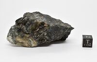 Коллекция Систематическая коллекция, №97880. Зеленоватые до чёрного крупнолистоватые агрегаты флогопита с кальцитом. Длина экспоната 6.5 см.