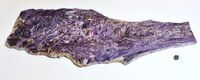 Коллекция Систематическая коллекция, №98487. Полированная с одной стороны пластина 63 х 25 х 0.8 см, сложенная агрегатом круплолейстового (до 6 см) и плойчатого чароита с оранжево-желтым тинакситом, чёрным эгирином и кварцем. Длина экспоната 63 см.