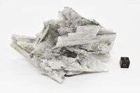 Коллекция Систематическая коллекция, №98799. Крупные дощатые пластины бесветного пектолита до 8.5 х 3 см в бесцветном натролите, кристаллы которого в друзовых полостях включают бледно-зеленоватые призмы фторапатита длиной до 2 см. С игольчатым эгирином. Длина экспоната 1 см.Размер минерала 8.5 см.