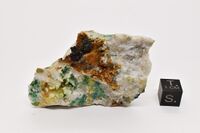 Коллекция Систематическая коллекция, №98969. Зелёные плоские сферолиты голдхиллита-филипсбергита до 4 мм по трещинам в кварце с байлдонитом, сегнититом, азуритом и лимонитом. Длина экспоната 6 см.