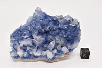 Коллекция Систематическая коллекция, №98981. Сростки ярко-синих шестоватых кристаллов дюмортьерита (до 2 мм) в основании кварцевой друзы на кварците. Длина экспоната 9.5 см.