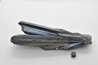 Коллекция Систематическая коллекция, №98989. Сросток (пучок) длиннопризматических хорошо огранённых кристаллов размером до 20 см с грубой комбинационной штриховкой и сложной, частично повреждённой, огранкой головок. В основании пучка серые примазки сурьмяных охр и мелкие сростки кристаллов кварца. Длина экспоната 21 см.