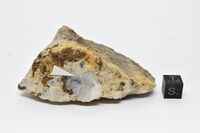 Коллекция Месторождения, №31667. Бесцветный полупрозрачный кристалл {112} размером 2х1.5см в полевошпатовом прожилке с мелкозернистым пиритом в миаските. Длина экспоната 7 см.Размер минерала 2 см.