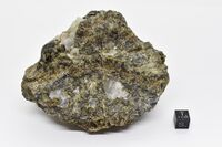 Коллекция Месторождения, №31768. Гранатовый скарн с гнездами кальцита и датолита. Hеравномерно окрашенный буровато-зеленый гранат гроссуляр-андрадитового ряда. Разной степени кристалличности: от сливного до хорошо раскристаллизованного и отдельных крупных (до 2 см) кристаллов, иногда блочных. Длина экспоната 11 см.