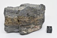Коллекция Месторождения, №31776. Ссайбелиитизированный людвигит. Мелкозернистый агрегат. Желтовато-серый ссайбелиит развивается по шестовато-игольчатому агрегату людвигита, обуславливая тонкополосчатую текстуру. Длина экспоната 9 см.