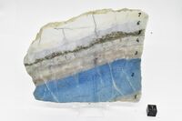 Коллекция Месторождения, №32349. Полированная с одной стороны пластина зонального субвулканического диффузионного скарна в карбонатных ксенолитах в габбро-перидотите. Состав зон: 1. Кварц. 2. Мелкозернистый голубой диопсид. 3. Монтичеллит-мелилитовый агрегат, замещенный гиллебрандитом. 4. Кальциевые гидросиликаты по монтичеллиту 5. Куспидин 6. Кальциевые гидросиликаты по монтичеллиту. 7. Фарфоровидный фошагит. Длина экспоната 15 см.