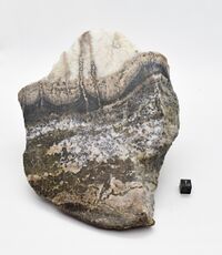 Коллекция Месторождения, №32374. Зональный биметасоматический скарн, сложенный волластонитом и зеленым андрадитом с мелкой вкрапленностью галенита и пересекаемый прожилками волластонита. Длина экспоната 20 см.