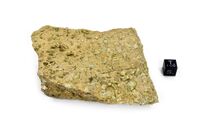 Коллекция Месторождения, №33003. Неравнозернистая апатит-кальцитовая порода - в основной массе мелкозернистого бежевого кальцита обильная вкрапленность хаотически ориентированных грубообразованных короткопризматических кристаллов светло-зелёного фторапатита до 1.5х0.6 см. Образец природно отпрепарирован - на поверхности частично растворённого кальцита выступают кристаллы апатита. Длина экспоната 9 см.Размер минерала 1.5 см.