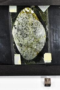 Коллекция Месторождения, №33036. Фрагмент ксенолита шпинелевого лерцолита (форстерит + энстатит + магнезиохромит) из кимберлита. Прозрачный шлиф размерами 10.5 х 7 х 0.2 см. Размер фрагмента породы в шлифе 9.2 х 5.5 см. Длина экспоната 10.5 см.