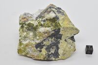 Коллекция Месторождения, №33170. Призматические кристаллы теллура до 1 см и их агрегаты до 4 х 1.5 см с зелёным эммонситом и бледно-бежевым парателлуритом. Длина экспоната 10 см.Размер минерала 3 см.