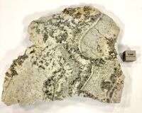 Коллекция Образования и превращения, №1414. Альбитизированный; текстура фестончатая, сложнополосчатая, структура неравномернозернистая. Рис. 123, 124.