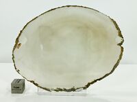 Коллекция Образования и превращения, №1585. Тангенциальный срез сферолитовой корки с тонкой зональностью, видимой на просвет, проходящей независимо от границ сферолитов. Разм. 13х10х0.2 см. Длина экспоната 13 см.