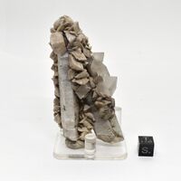 Коллекция Образования и превращения, №1751. Две генерации ромбоэдрических кристаллов кальцита (бесцветные и белые) на кварце. Присыпка пирита. Длина экспоната 9 см.