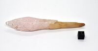 Коллекция Образования и превращения, №1878. Автоэпитаксия бледно-розового расщепленного скаленоэдрического 7см кристалла с блочными гранями на обелисковидном призматическом 6см кристалле с гладкими гранями. Длина экспоната 14 см.