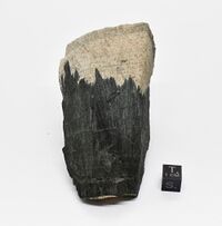 Коллекция Образования и превращения, №2058. Темно-зеленый волокнисто-шестоватый агрегат геденбергита пламеневидной структуры замещает ритмично-зональный датолит-Mn-волластонитовый скарн. Длина экспоната 11 см.