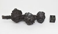 Коллекция Образования и превращения, №2494. Агрегат, состоящий из сросшихся конкреций, сложенных кубическими кристаллами пирита полностью замещенных лимонитом. Длина экспоната 8 см.