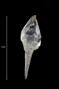Коллекция Образования и превращения, №3109. Скипетровидный сросток кристаллов бесцветного прозрачного кальцита скаленоэдрического габитуса. Размер 2.8 х 1 х 1см. Длина экспоната 2.8 см.Размер минерала 2.8 см.