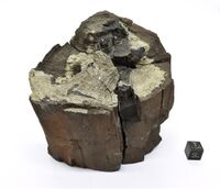 Коллекция Образования и превращения, №3350. Фрагмент цилиндрической формы концентрически зонального ствола дерева, замещенного апатитом с мелкокристаллическим пиритом по трещинам. Длина экспоната 10 см.