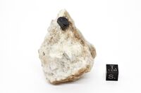 Коллекция Кристаллы, №5191. Кристалл Nb-содержащего перовскита кубического габитуса размером 9 мм по ребру в кальцит-доломитовом крупнозернистом карбонатите. Длина экспоната 7 см.Размер минерала 1 см.