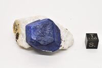 Коллекция Кристаллы, №5431. Чёткий ромбободекаэдр (с узкими гранями куба и тетрагонтриоктаэдра) густо-синего лазурита размером 3.5 х 2.5 х 2 см в белом кальцитовом мраморе с зёрнами пирита. Длина экспоната 6 см.Размер минерала 3.5 см.