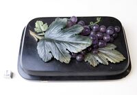 Коллекция Поделочные и драгоценные камни, №1138. Мрамор, нефрит, змеевик, аметист. Presse-papier. 16.5x10.5см. Вес 1215 г. Пресс сделан, по-видимому, на Императорской Екатеринбургской гранильной фабрике(М.Б. Чистякова, 2007. с.105-107). Гроздь винограда из аметиста на основании из черного мрамора. Длина экспоната 16.5 см.