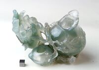 Коллекция Поделочные и драгоценные камни, №1502. Вазочка китайской работы новых времен с повреждениями. h=14 l=10 см Сосуд в виде плодов пальчатого лимона, лимона и граната. Кварц. 10.9х15.15х7.4 см. XIX - начало XX века. Вырезанная из просвечивающего светлого, голубовато-зеленого халцедона группа из трех плодов. Плоды смыкаются друг с другом, оплетены стеблями и листьями, дополнены цветками и маленьким гранатом. Длина экспоната 14 см.