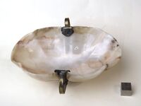 Коллекция Поделочные и драгоценные камни, №1509. Вазочка овальная с орнаментом в серебряной слегка вызолоченой оправе. h=4.2 d=11.8x10.2 см Длина экспоната 11.8 см.