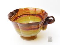 Коллекция Поделочные и драгоценные камни, №1524. Чашка с ручкой работы Фаберже начала ХХ века. Агат, резьба по камню d=10 h=6.5 Вес 197,9 г. Длина экспоната 10 см.