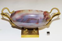 Коллекция Поделочные и драгоценные камни, №1528. Вазочка овальная на бронзовой подставке с такими же ручками (не драг. метал.). l=20 h=10.5 Длина экспоната 20 см.