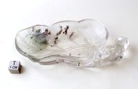 Коллекция Поделочные и драгоценные камни, №1553. Латочек в виде листа, китайской работы нового времени. h=11.5x5.5 на выпуклой стороне листа имеется зеленоватое пятно, которое мастер использовал для маленькой горельефной лягушки, изображенной схематично. Длина экспоната 11.5 см.