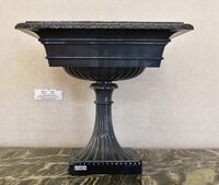Коллекция Поделочные и драгоценные камни, №1610. Ваза большая четырехугольная плоская на высокой ножке. Работа Екатеринбургской гранильной фабрики, мастер Коковин, 1828 г. Предположительно по рисунку архитектора И.И. Гальберга от 13 декабря 1826 г.(Мавродина. 2003. С. 72, 85-86). По данным В.Б. Семенова и др., работа над ней началась в 1826 г., стоимость - 1644 р. 63 к.( Семенов и др. 2003, т. 1, с. 349). См. также М.Б. Чистякова. 2007. С.103. h=30 33x33 Квадратная чаша с отогнутым бортом, профилированным туловом и округлым низом, украшенным выпуклыми ложками, располагается на расширяющейся книзу ножке с вогнутыми лоржками, опирающейся на квадратный плинт. Внутри украшена резьбой в виде круглой розетки из вогнутых ложек. Длина экспоната 33 см.