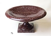 Коллекция Поделочные и драгоценные камни, №1615. Ваза плоская. h=15 d=30 небольшая ваза из красного коргонского порфира. Круглая плоская чаша на невысокой стройной ножке. Длина экспоната 30 см.