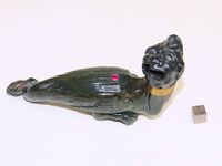 Коллекция Поделочные и драгоценные камни, №1622. Ручка от тросточки. Фантастическое чудовище с золотым ошейником. Фигурка из гелиотропа, ошейник - золото 583 пробы, лигатурный вес 3.7 г. Общий вес 230.9 г. 13.5х7 см Длина экспоната 13.5 см.
