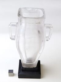 Коллекция Поделочные и драгоценные камни, №1652. Вазочка с двумя ручками на черной подставке. h=14 Длина экспоната 14 см.