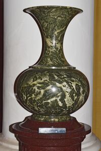 Коллекция Поделочные и драгоценные камни, №1701. Ваза. Колыванская гранильная фабрика, 1891 г.(Мавродина .М.Искусство русских камнерезов XVIII-XIX в. Изд. Гос. Эрмитажа. СПб. 2007. С.386).h=75 Порчовая яшма. Высота 69 см. Ваза из трех смонтированных частей. на плоском круглом профилированном основании располагается слегка сплющенное шарообразное тулово, переходящее в узкое, расширяющееся к верху открытое горло. Граница горла с туловом подчеркнута тонким вертикальным пояском. Длина экспоната 75 см.