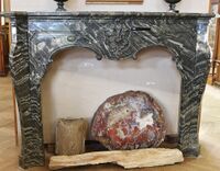Коллекция Поделочные и драгоценные камни, №1704. Камин работы Колыванской фабрики, 1861-1863 г. По заказу кабинета Его Императорского Величества 1856 г. Период изготовления 8.03.1861-24.02.1863. (надворный Советник Злобин).Стоимость 3486р. h=130 Ревневская волнистая яшма.Простая декорировка - низкие плоские профили отдельных частей, рельефные скругленные тяги на передней и боковых стенках, раскреповка углов верхней доски и завершений пилястр по углам. Единственное резное украшение расположено в центре передней доски. Это растительный мотив в медальоне сложной формы. Длина экспоната 130 см.
