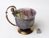 Коллекция Поделочные и драгоценные камни, №1750. Моховик фиолетово-зеленый. Чашка в металлической оправе на ножке. Работа фирмы Фаберже, мастер Мих. Перхин. h=5.5 d=5.5 без ручки. Вес 117,3 г. Длина экспоната 5.5 см.