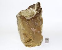 Коллекция Поделочные и драгоценные камни, №1753. Пепельница в сыром куске с резной фигурой "деворыбоптицы". Возможно, работа Петергофской гранильной ф-ки рубежа 19-20 вв. h=11 Вес 895 г. d=10x6.5 (Чистякова М.Б Новые данные о минералах 2011 В.46. с.94-113). Длина экспоната 11 см.