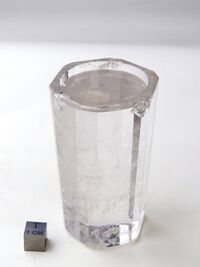 Коллекция Поделочные и драгоценные камни, №1758. Стакан гранененый "с водой". Возможно, работа Петергофской гранильной ф-ки рубежа 19-20 вв. h=8 d=5 d=4 (Чистякова М.Б. Новые данные о минералах. 2011. В. 46, с. 94-113). Длина экспоната 8 см.