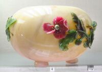 Коллекция Поделочные и драгоценные камни, №1808. Ваза белоречитовая с накладныим фигурными украшениями из других камней - халцедона, родонита, бирюзы, лабрадорита,тигрового глаза, нефрита, бирюзы. Петергофская гранильная фабрика. 1900 г. Стоимость 1300 р.(Мавродина Н.И. 2007 г.; Чистякова М.Б.Новые данные о минералах 2011г.В 46, с. 94-113) Длина экспоната 12.5 см.
