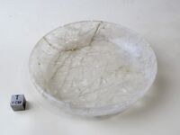 Коллекция Поделочные и драгоценные камни, №2279. Кварц белый трещиноватый. Тарелочка круглая. Возможно, работа Петергофской гран. ф-ки. Длина экспоната 12 см.
