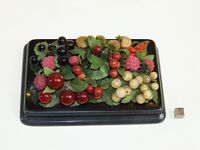 Коллекция Поделочные и драгоценные камни, №4816. Пресс для бумаг. Малина - родонит, гипс; смородина - кварц, гагат. подставка, рябина - яшма. 17х11 см. Пресс подарен музею А.Н. Куприяновым. По его словам, пресс в 1860-х годах был подарен его деду сибирским промышленником Михайлой Петровым. Может быть как изделием Екатеринбургской гранильной фабрики, так и екатеринбургских кустарей (М.Б. Чистякова.2007. С.106-107). Длина экспоната 17 см.