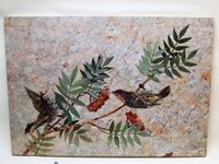 Коллекция Поделочные и драгоценные камни, №5380. Доска с изображением птиц на рябине. 56х39 см. Разноцветные яшма, крупнозернистый мрамор. Длина экспоната 56 см.